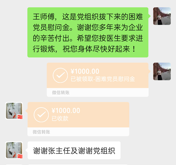 “现在身体怎么样?生活可有什么困难?”因受疫情影响,不能对所有困难党员和困难职工实现入户走访,公司党委和工会就通过电话一一联系,仔细询问他们疫情防控期间生活情况、身体健康状况,根据他们的实际情况,将慰问金通过微信转账发给个人,米面油等慰问品能送到小区门口的送到小区门口,能送到工地的送到工地。